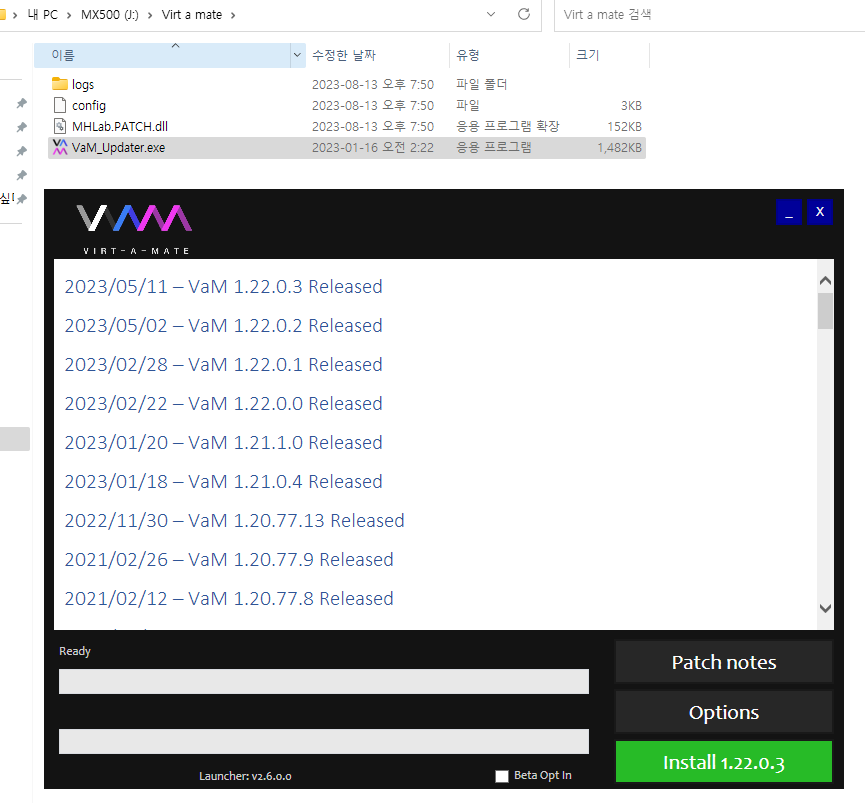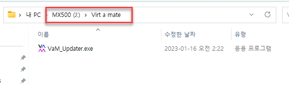 주의할 점은, 설치할 폴더에 Vam_Updater.exe 파일을 가져다 놓는 것을 추천한다. 실행을 하게 되면, 해당 폴더에 잡스러운 vam 파일들이 설치되는 식이다. 다른 스팀 게임처럼 C 드라이브로 저장 경로를 설정하고 그런 거 없다. 먼저 설치할 경로에 exe 파일을 가져다 놓고, 해당 폴더에서 주르르륵, 다운로드 받는 식이다.