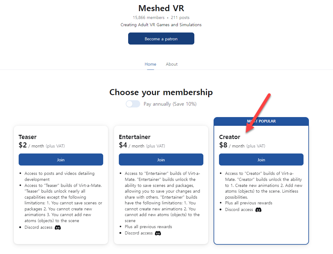 키 구하는 방법은 여러가지 갈래가 있다. 먼저 공식적인 루트를 활용하는 방식이다. 공식적인 루트가 어디냐? 바로 vam 제작자의 패트리온이다. 패트리온에 후원을 하게 되면, 공식 키를 얻을 수가 있다.