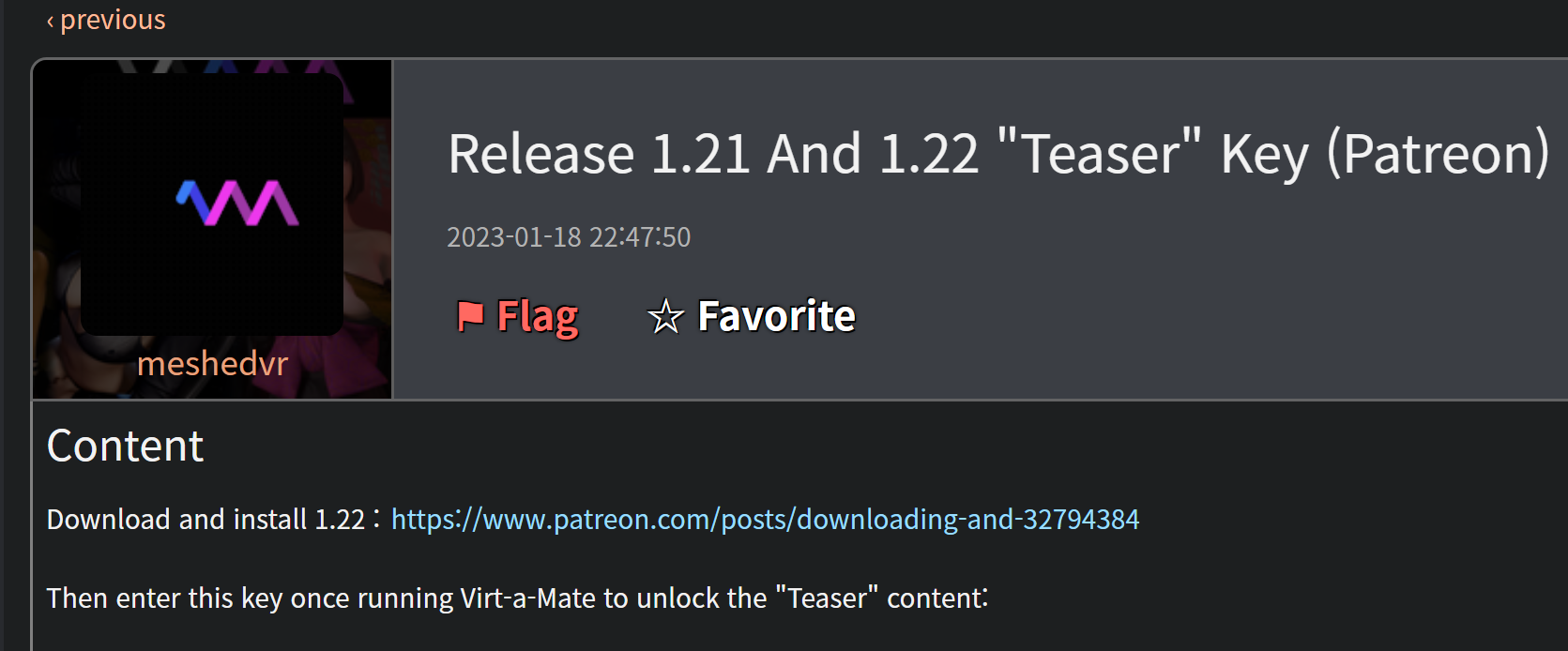 이렇게 MeshVR이 패트리온에 올린 게시물을 찾아서 들어갈 수가 있다. 코드는 최소한의 양심상 이 글에서 공개하지 않을 테니, meshvr 케모노 사이트에 들어가서 확인하길 바란다. 크리에이터키를 얻었다면, 설치된 Vam을 실행시켜 보자. 대체 뭘 해야 하는지 알아봐야 한다.